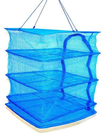 Сушилка изготовлена из прочного полимерного сетчатого материала с ячеей 3 мм , натянутого на металлический каркас. Благодаря мелкой ячее насекомые не могут проникнуть внутрь сушилки, а большое расстояние между полками и сетчатый материал дают возможность хорошего проветривания и сушки рыбы со всех сторон.