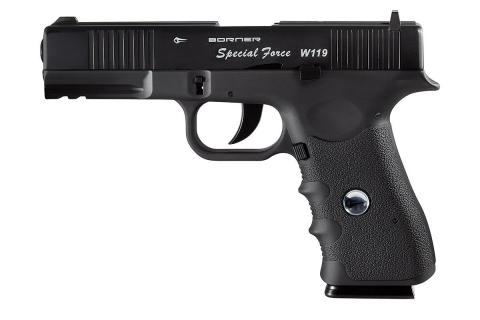 Borner Special Force W119 – пистолет произведен из металлического сплава, а рукояти — из пластика, ствол выполнен из стали, гладкий. Длина пистолета — 200 мм, масса составляет 750 грамм. Работает пистолет Borner Special Force W119 по принципу действия газобаллонной пневматики. В качестве источника энергии выступают стандартные баллончики CO2 на 12 грамм. Снарядами для стрельбы же выступают шарики из стали, так называемые ВВ калибром 4,5 мм. Вместимость магазина данного пистолета — 12 шт. Начальная скорость полета шарика — 115 м/с. Также пневматический пистолет Borner Special Force W119 оснащен системой Blowback, это означает, что затворная рамка пистолета движется при стрельбе после взвода курка, создает имитацию стрельбы реальной боевой модели. Благодаря данной системе, этот пистолет отлично подойдет в качестве учебной или развлекательной цели.