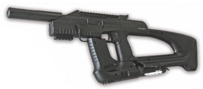 Оружие изготовлено из прочного и надежного пластика, который покажет хорошие сроки эксплуатации и износоустойчивость, а также за счет него пистолет имеет относительно не тяжелый вес, 2,6 кг. Приклад для удобства съемного типа, а на стволе установлен саундмодератор.