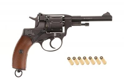 СО2. Ёмкость барабана: 7 ВВ стальной дроби в капсулах фальшпатронов. Калибр /.177. Начальная скорость - 110 м/с. Материал корпуса - металл.