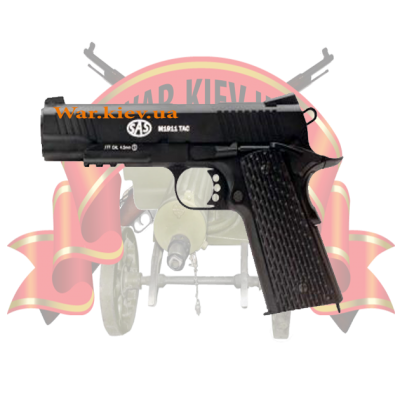 По своему внешнему виду SAS M1911 Tactical имеет схожесть с американским Colt 1911. Вес он имеет тоже довольно таки внушительный, аж до 900 гр., что придает ему еще большей похожести с боевым пистолетом. И что не мало важно, есть автоматика, которая в точности копирует работу настоящего боевого огнестрельного оружия, это всё в полной мере Вы ощутите при стрельбе. Материал накладок на рукояти сделан из прочного качественного пластика, поэтому взяв в руки, Вы ощутите только отличное качество сборки, в руке он ложится великолепно, при стрельбе не будет дисокмфорта. Его индивидуальность в том, что у пистолета два предохранителя – неавтоматический и автоматический. Один из них расположен внизу, под затворной рамой и выведен направую и левую сторону. Другой, находится на тыльной стороне рукояти. Ствол изготовлен из латуни. На пистолет можно одевать планку, чтобы закрепить различные аксессуары. Стреляет SAS M1911 Tactical шариками калибра 4,5 мм. Магазин вмещает их 19 шт. Энергией для выстрела служит баллон с СО2, весом в 12 гр. Всего из одного баллона делается до 50 выстрелов. Скорость пули достигает 95 м\с. В общем и целом это прекрасный выбор для развлекательной стрельбы.