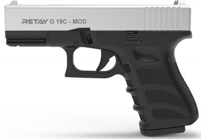 Стартовый пистолет Retay G19C Chrome выполнен по образцу и подобию огнестрельного пистолета  Glock 19. В данном случае стрельбу возможно вести только холостыми патронами калибра 9 мм. Канал ствола полностью заглушен, что предупреждает возможность его использования для стрельбы даже резиновыми патронами. Для отвода пороховых газов предусмотрено отверстие в стволе за патронником.