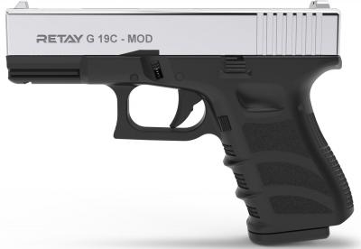 Стартовый пистолет Retay G19C Nickel выполнен по образцу и подобию огнестрельного пистолета Glock 19. В данном случае стрельбу возможно вести только холостыми патронами калибра 9 мм. Канал ствола полностью заглушен, что предупреждает возможность его использования для стрельбы даже резиновыми патронами. Для отвода пороховых газов предусмотрено отверстие в стволе за патронником.