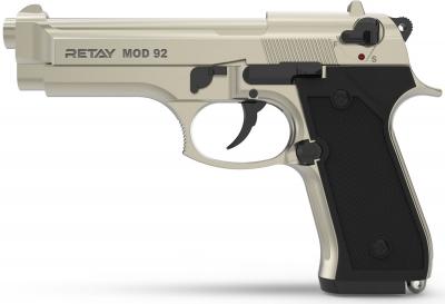 Стартовый пистолет Retay Mod 92 Satin является копией итальянского пистолета Beretta 92FS, которая в настоящее время стоит на вооружении в армии США, Италии и ряде других стран мира, а также используется полицейскими и сотрудниками спецслужб. Стартовый пистолет предусматривает стрельбу холостыми патронами калибра 9 мм, канал ствола полностью заглушен, что исключает возможность использования других патронов. Отвод пороховых газов осуществляется через отверстие, расположенное в верхней части ствола за патронником. Стоит отметить, что изменение конструкции стартовых пистолетов противозаконно. Корпус Retay Mod 92 Satin изготовлен из металла, что гарантирует долгий срок службы. Ствол и 15-ти зарядный магазин выполнены из оружейной стали. Модель комфортно сидит в руке благодаря эргономичной рукоятке. Стартовый пистолет Retay Mod 92 Satin выполнен максимально достоверно: длина 212 мм, а высота 140 мм. Кроме того, вес модели составляет 1155 грамм, это позволяет в полной мере ощутить сходство с прототипом.