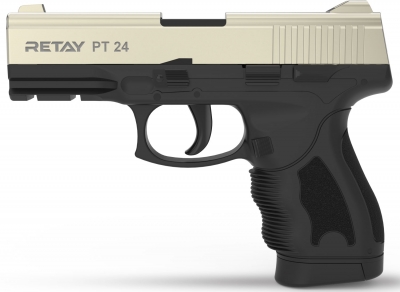 Помимо стильного внешнего вида, модель оснащена качественным механизмом. Материал рамки ударостойкий пластик, благодаря этому пистолет не подвержен коррозии. Вес оружия составляет 870 грамм. Особого внимания заслуживает эргономичная рукоятка, которая очень комфортно сидит в руке. Пистолет отлично сбалансирован-длина 180 миллиметров, а высота 136 миллиметров. Магазин Retay PT24 Satin выполнен из оружейной стали, пятка из пластика, может вмещать 15 патронов.
