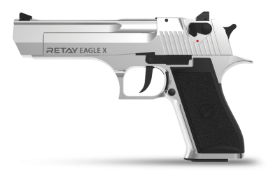 Долгожданная новинка-стартовый пистолет Retay Eagle chrome. Модель является копией легендарного пистолета Desert Eagle (Пустынный орел), который часто встречается в фильмах и компьютерных играх Пистолет никогда не применялся в качестве армейского или полицейского оружия, так слишком дорогостоящий и к тому же слишком тяжёл- более 2 кг. Производитель позиционирует «Пустынного орла» в качестве средства самообороны и охотничьего оружия, но совладать с этим пистолетом по силам далеко не каждому.