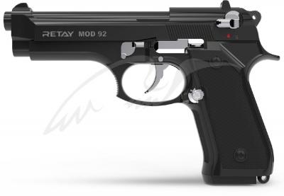 Стартовый пистолет Retay Mod 92 black/nickel является копией итальянского пистолета Beretta 92FS, которая в настоящее время стоит на вооружении в армии США, Италии и ряде других стран мира, а также используется полицейскими и сотрудниками спецслужб. Стартовый пистолет предусматривает стрельбу холостыми патронами калибра 9 мм, канал ствола полностью заглушен, что исключает возможность использования других патронов. Отвод пороховых газов осуществляется через отверстие, расположенное в верхней части ствола за патронником. Стоит отметить, что изменение конструкции стартовых пистолетов противозаконно. Корпус Retay Mod 92 black/nickel изготовлен из металла, что гарантирует долгий срок службы. Ствол и 15-ти зарядный магазин выполнены из оружейной стали. Модель комфортно сидит в руке благодаря эргономичной рукоятке. Стартовый пистолет Retay Mod 92 black/nickel выполнен максимально достоверно: длина 212 мм, а высота 140 мм. Кроме того, вес модели составляет 1155 грамм, это позволяет в полной мере ощутить сходство с прототипом.