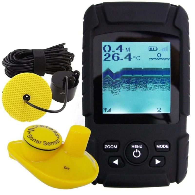 Хорошо видны бровки. Если привязать беспроводной датчик к лодке, то он будет также эффективен для замера глубин, рельефа и поиска рыбы с плавсредства. Эхолот Fish finder легко использовать для зимней рыбалки. Из-за отсутствия проводов, которые на морозе имеют свойство ломаться. Беспроводной эхолот начинает работать когда датчик оказывается в воде, так как на его нижней части есть 2 контакта, которые при попадании в воду образуют электрическую цепь и fishfinder начинает работать.