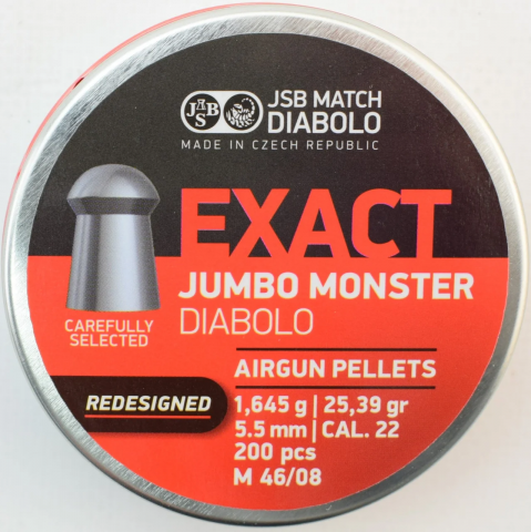 Diabolo Exact Jumbo - боеприпас для пневматических винтовок калибра .22 сверх-высокой мощности. Рекомендуемый диапазон дульной энергии винтовок - от 50 до 70 Джоулей. Лучший выбор для охотничьей стрельбы из пневматики калибра 5,5 мм!
