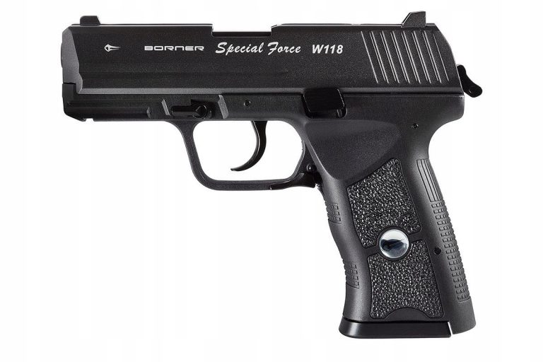 Borner Special Force W118 – пистолет произведен из металлического сплава, а рукояти — из пластика, ствол выполнен из стали, гладкий. Длина пистолета — 180 мм, масса составляет 750 грамм. Работает пистолет Borner Special Force W118 по принципу действия газобаллонной пневматики. В качестве источника энергии выступают стандартные баллончики CO2 на 12 грамм. Снарядами для стрельбы же выступают шарики из стали, так называемые ВВ калибром 4,5 мм. Вместимость магазина данного пистолета — 12 шт. Начальная скорость полета шарика — 115 м/с. Также пневматический пистолет Borner Special Force W118 оснащен системой Blowback, это означает, что затворная рамка пистолета движется при стрельбе после взвода курка, создает имитацию стрельбы реальной боевой модели. Благодаря данной системе, этот пистолет отлично подойдет в качестве учебной или развлекательной цели.