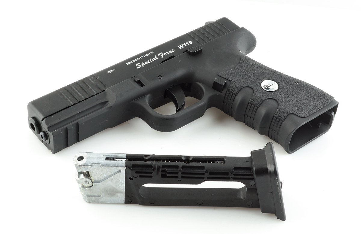 Borner Special Force W119 – пистолет произведен из металлического сплава, а рукояти — из пластика, ствол выполнен из стали, гладкий. Длина пистолета — 200 мм, масса составляет 750 грамм. Работает пистолет Borner Special Force W119 по принципу действия газобаллонной пневматики. В качестве источника энергии выступают стандартные баллончики CO2 на 12 грамм. Снарядами для стрельбы же выступают шарики из стали, так называемые ВВ калибром 4,5 мм. Вместимость магазина данного пистолета — 12 шт. Начальная скорость полета шарика — 115 м/с. Также пневматический пистолет Borner Special Force W119 оснащен системой Blowback, это означает, что затворная рамка пистолета движется при стрельбе после взвода курка, создает имитацию стрельбы реальной боевой модели. Благодаря данной системе, этот пистолет отлично подойдет в качестве учебной или развлекательной цели.