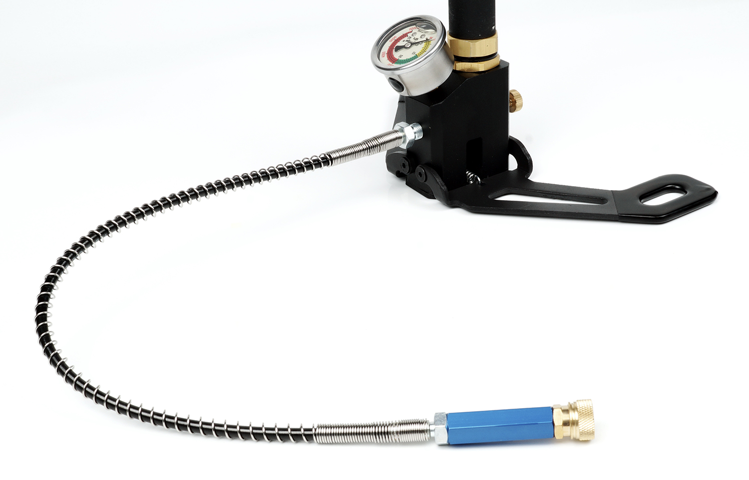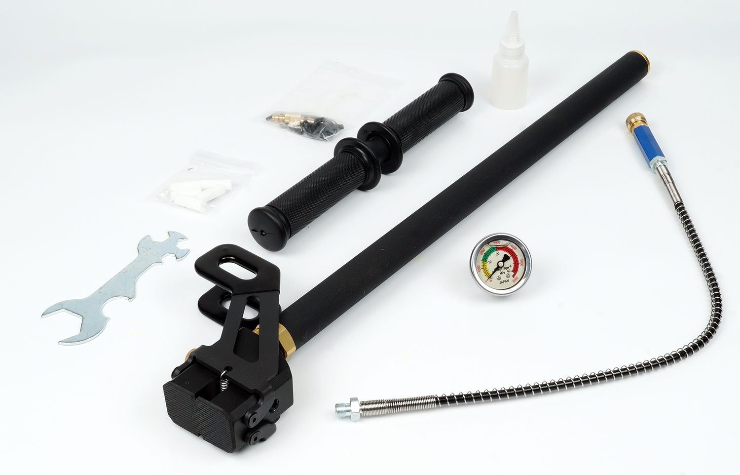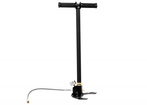 Четырёхступенчатый ручной насос высокого давления - предназначен для заправки PCP винтовок. Длина насоса в закрытом состоянии составляет 630 мм, а в открытом - 1100 мм. Вес насоса 2,4 килограмма. Рабочее давление 300 Бар. Насос оборудован удобной складной подножкой.