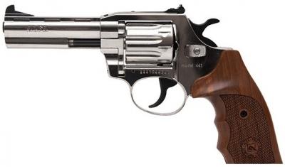 Револьвер под патрон Флобера чешской фирмы Alfa 441 4' (никель, дерево)-очень практичный и удобный. Высокоточный в стрельбе и простой в использовании. Анатомическая рукоять выполнена из натурального дерева и очень удобно лежит в руке. 9-ти зарядный барабан из стали откидывается влево для заряда. Тип боеприпасов-патроны Флобера. Прицельные приспособления представлены в виде прицельной планки и мушки. Общая длина составляет 231 мм, а длина стального нарезного ствола- 101 мм. Вес револьвера 860 грамм. Начальная скорость пули составляет около 180 м/с. Комплектуется револьвер кейсом и ершиком для чистки.